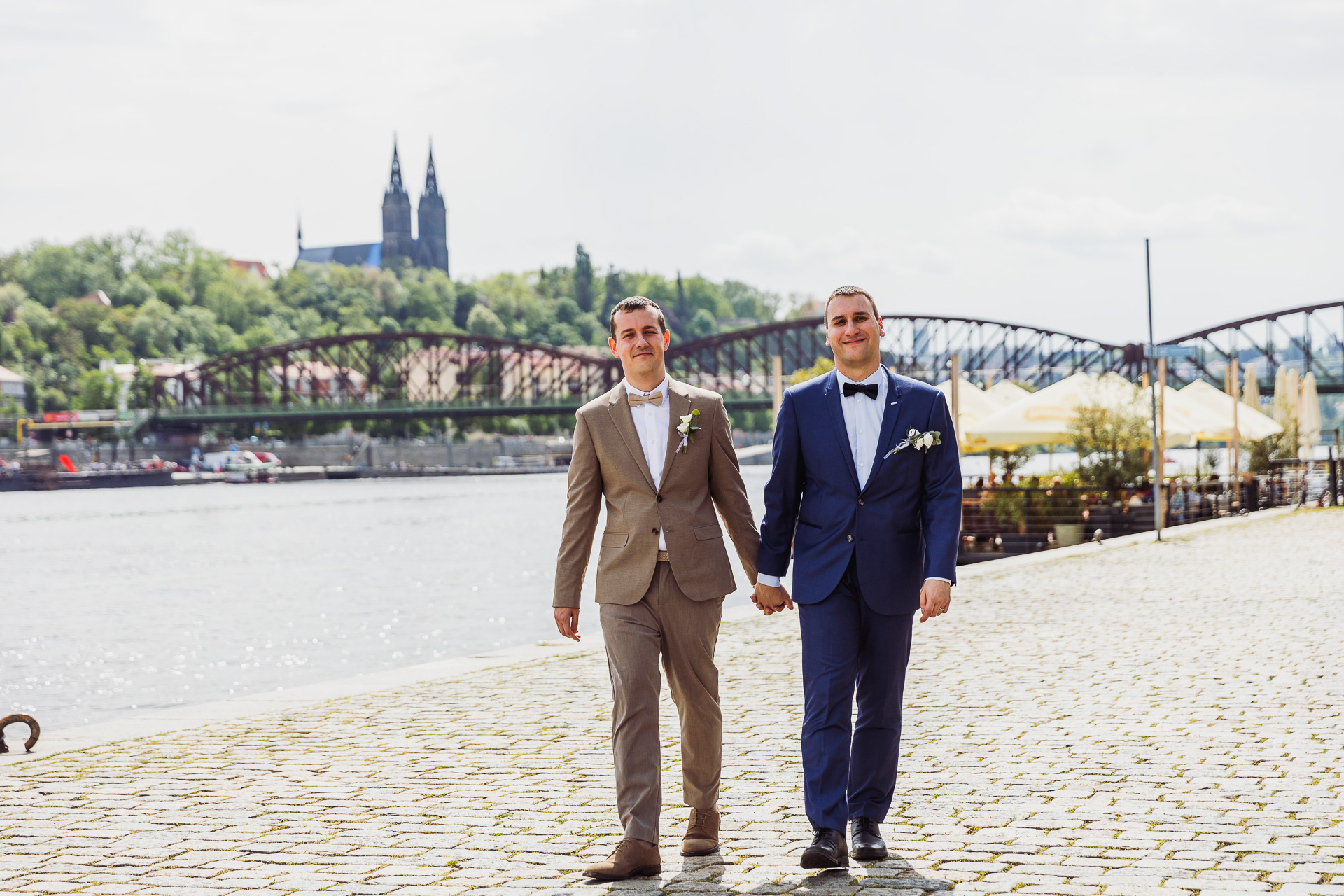 nevěsta s ženichem se kochají výhledem na Prahu z Pražského hradu