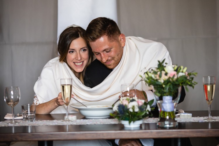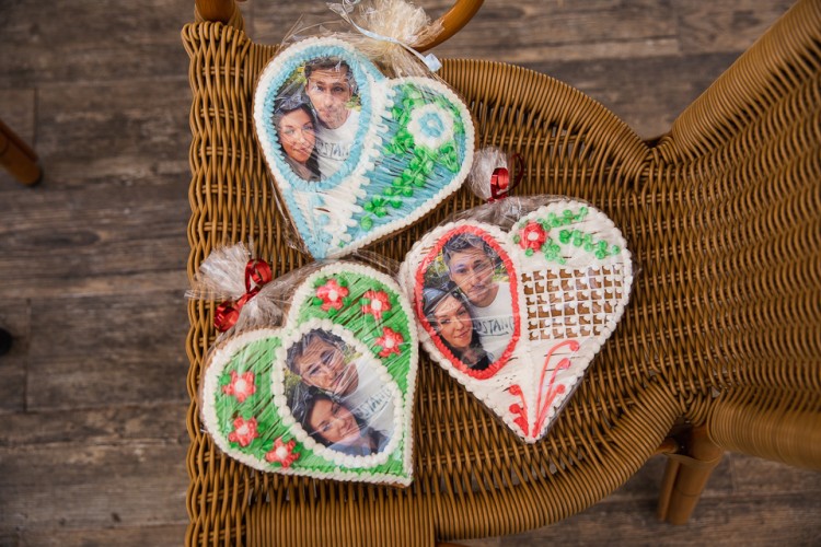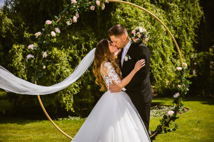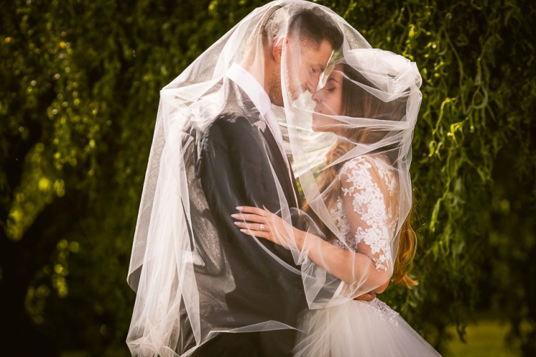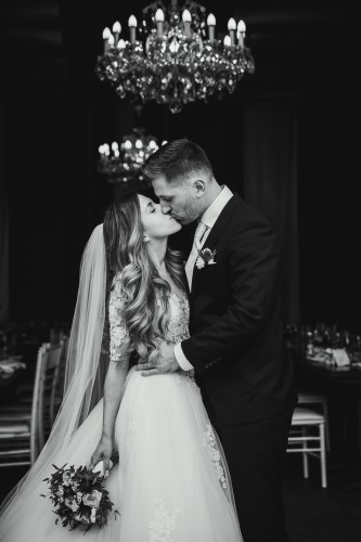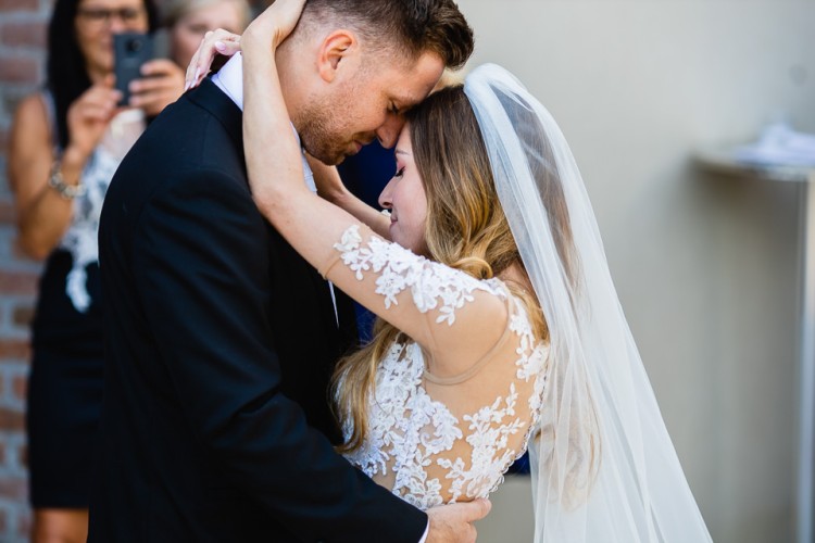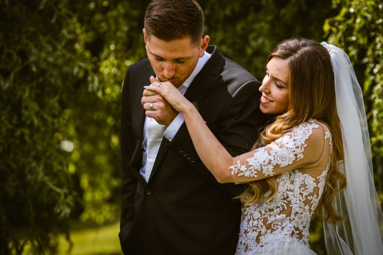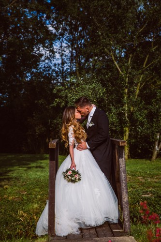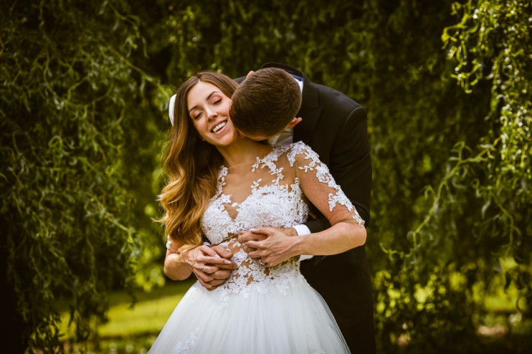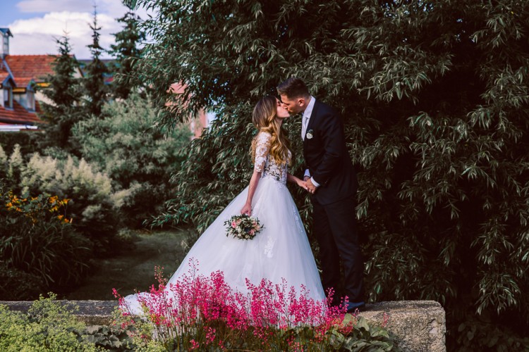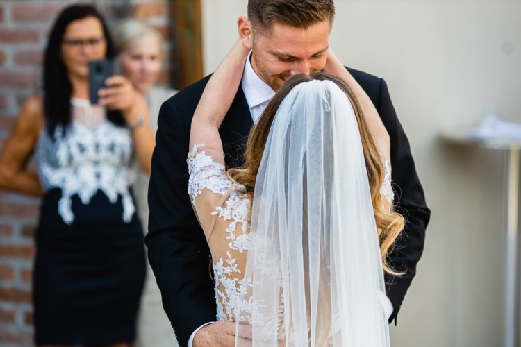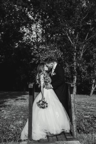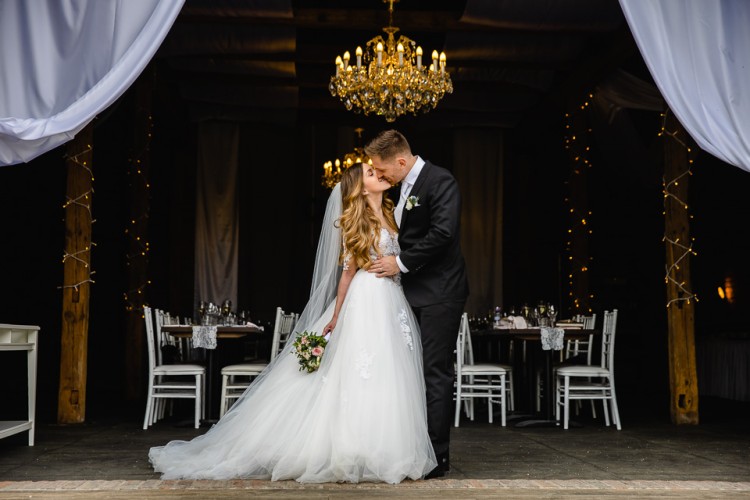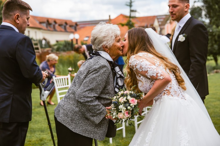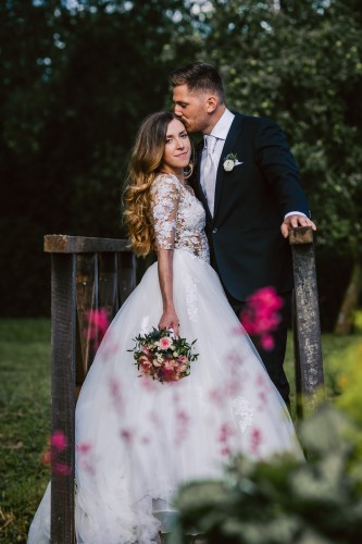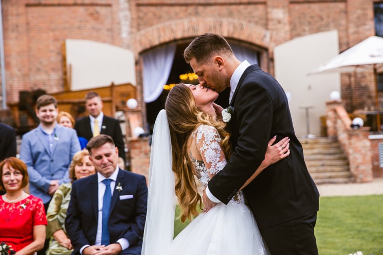 ženich líbá nevěstu před stodolou Dvůr Hoffmeister